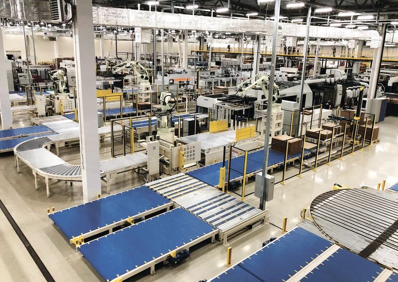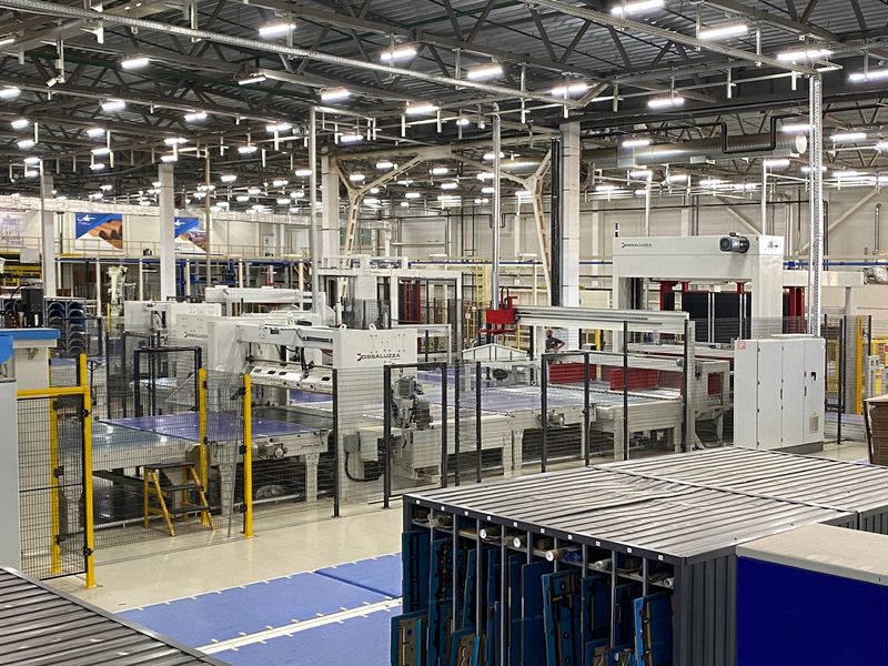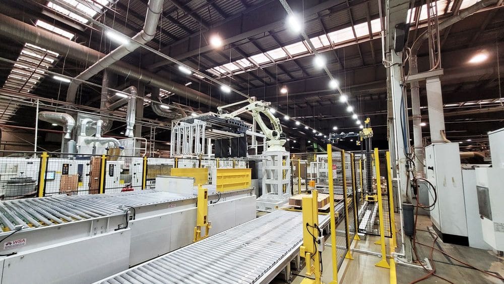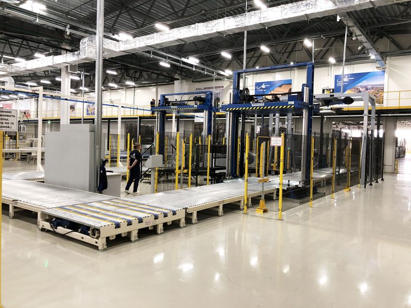 Решения: Установлены транспортные системы для перемещения готовой продукции, автоматизированные конвейеры для передачи товаров на склад, а также роботы-паллетайзеры. Внедрено оборудование для обвязки и упаковки, что позволяет сохранять высокое качество продукции.