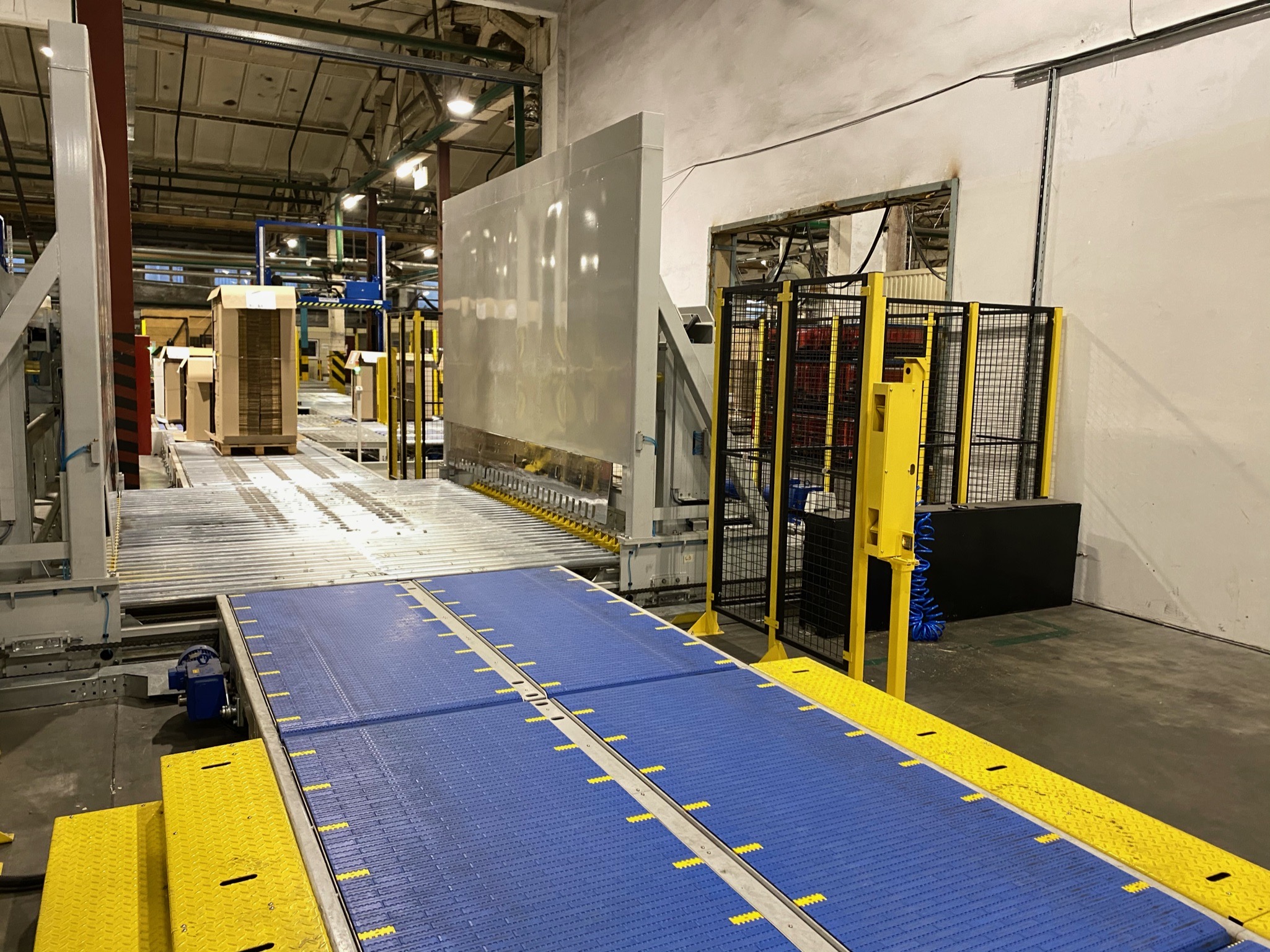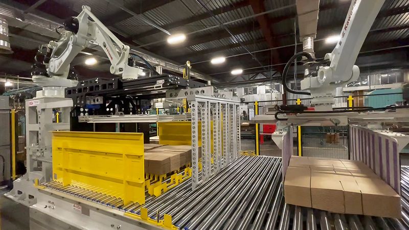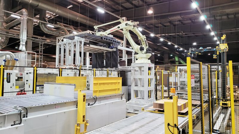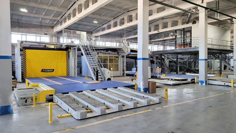 Решения: Внедрены системы подачи бобин, съема готовой продукции и автоматизированные конвейеры. Установлены роботы-паллетайзеры, а также оборудование для обвязки и упаковки, обеспечивающее сохранение качества продукции.