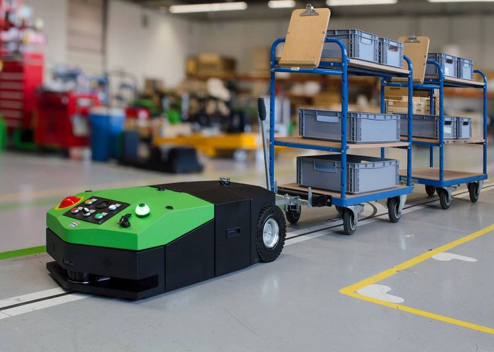 Работает как тягач, применяется для перемещения тяжелых грузов. Перемещает неавтоматизированные тележки по заданной траектории в точки загрузки/выгрузки